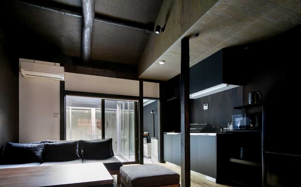 「trive kamejima II」のリビングは、宿の中心となる“つながりの場”。木の梁と白壁、格子のある窓からの光と間接照明が交差し、“日本らしさ”と“居心地の良さ”を絶妙なバランスで感じさせてくれます。
