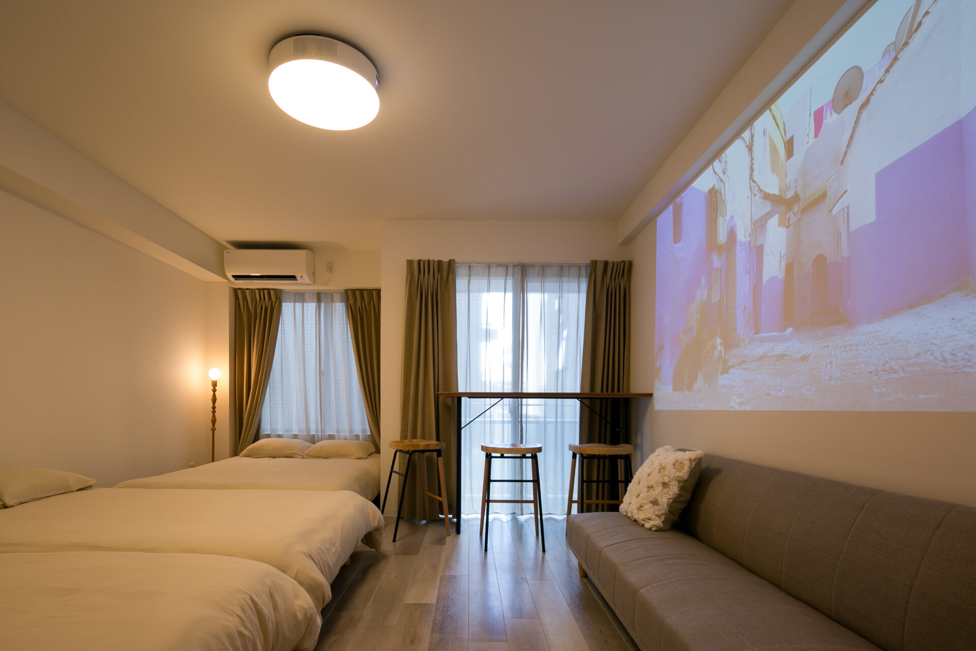 壁一面がスクリーンになり、映画やライブ映像を大画面で楽しめます。旅先でも“お部屋がシアターになる”特別な時間をぜひ。