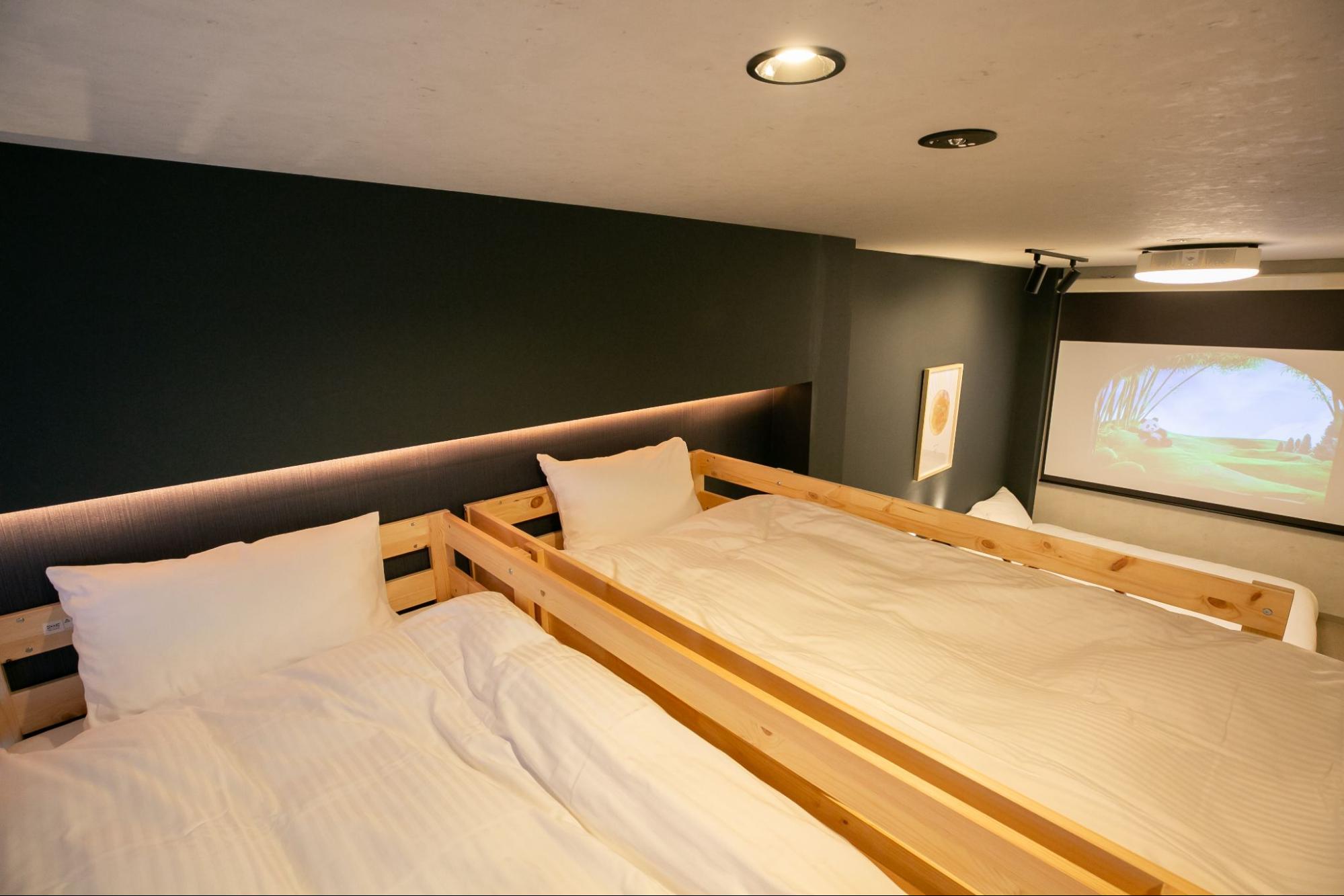 寝室には大画面スクリーンを完備。